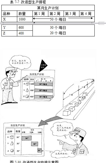 这种生产排程以天为单位,与传统的以月为单位的排程相比,其库存与满足市场需求方面都有较大改善。但是,从图7-30可以看出,在每日的生产安排中,仍然是分段生产,先生产品种X 50个,再生产品种Y 30个,最后生产品种Z 20个。