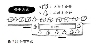 所谓分支方式,就是对超出“正常生产排程”(相对通常的情况而言)的部分,通过设立分支组装线来进行消化的方式(图7-35)。例如:产品A有10个零件要进行组装,而产品B则需要组装18个零件,这两种产品的组装标准工时可能不一样,但是产距时间仍然必须相同,解决的方法就是设立分支组装线,将不同产品超多的作业量之作业分出来在分支组装线上进行生产,直到正常作业量部分再返回正常的生产线内。当然,在分支组装线上也必须配置作业人员来进行生产。如此,并没有对原来的生产线上的人员构成什么影响。即生产量的变化没有影响到原生产线的平衡状况。