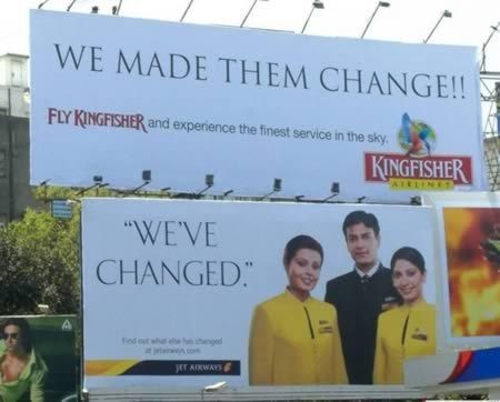 印度最大的航空公司之一 Jet Airways 声明说,“我们改变了”;于是 Kingfisher Airlines (另一家竞争性的公司)也做了一个户外广告,发布在其广告牌上方,写到“是我们逼他们改的”……
