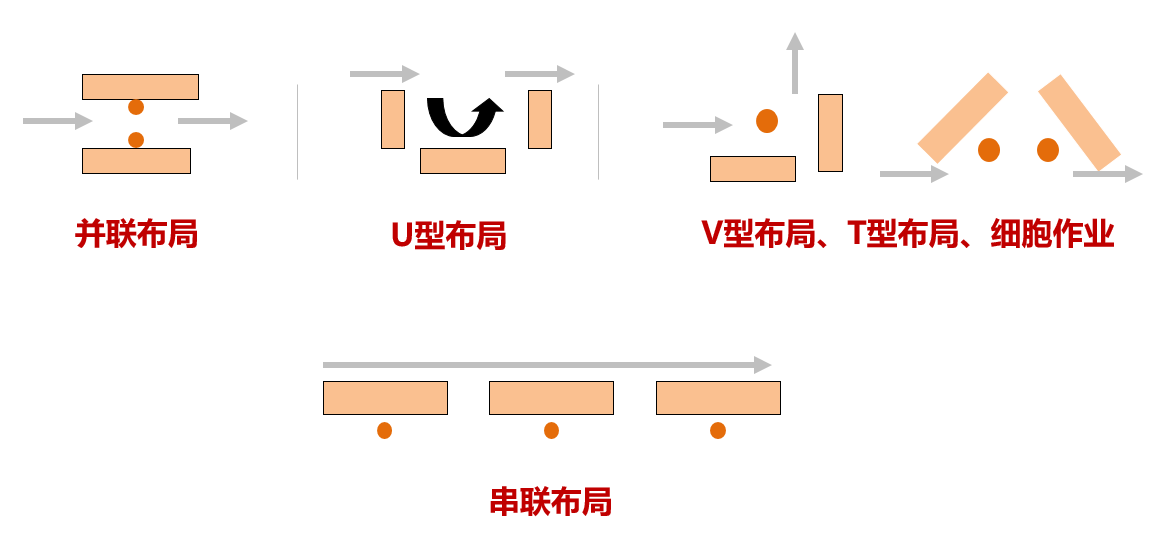 精益布局的应用方法主要抓住“单件流”这一精益化的核心思想。图5-3、图5-4为精益布局模式和示意图。