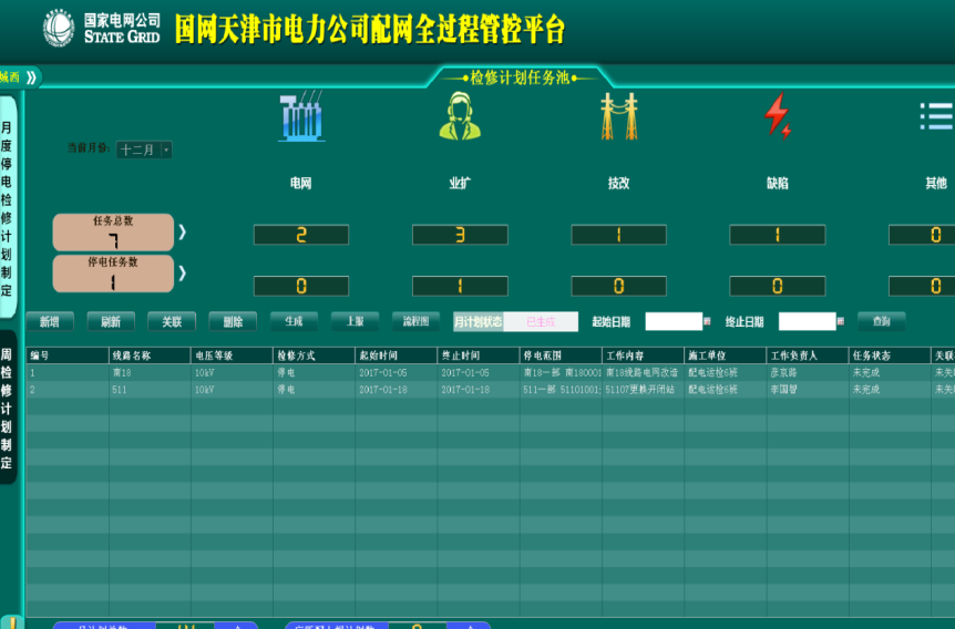 检修任务池中将不同任务按类型进行分类,并可生成月计划和周计划,班组人员可对计划进行新增、修改、删除、关联等操作,进而上报调度,班组人员随时查看计划的审批情况,为安排班组的工作计划提供支撑。