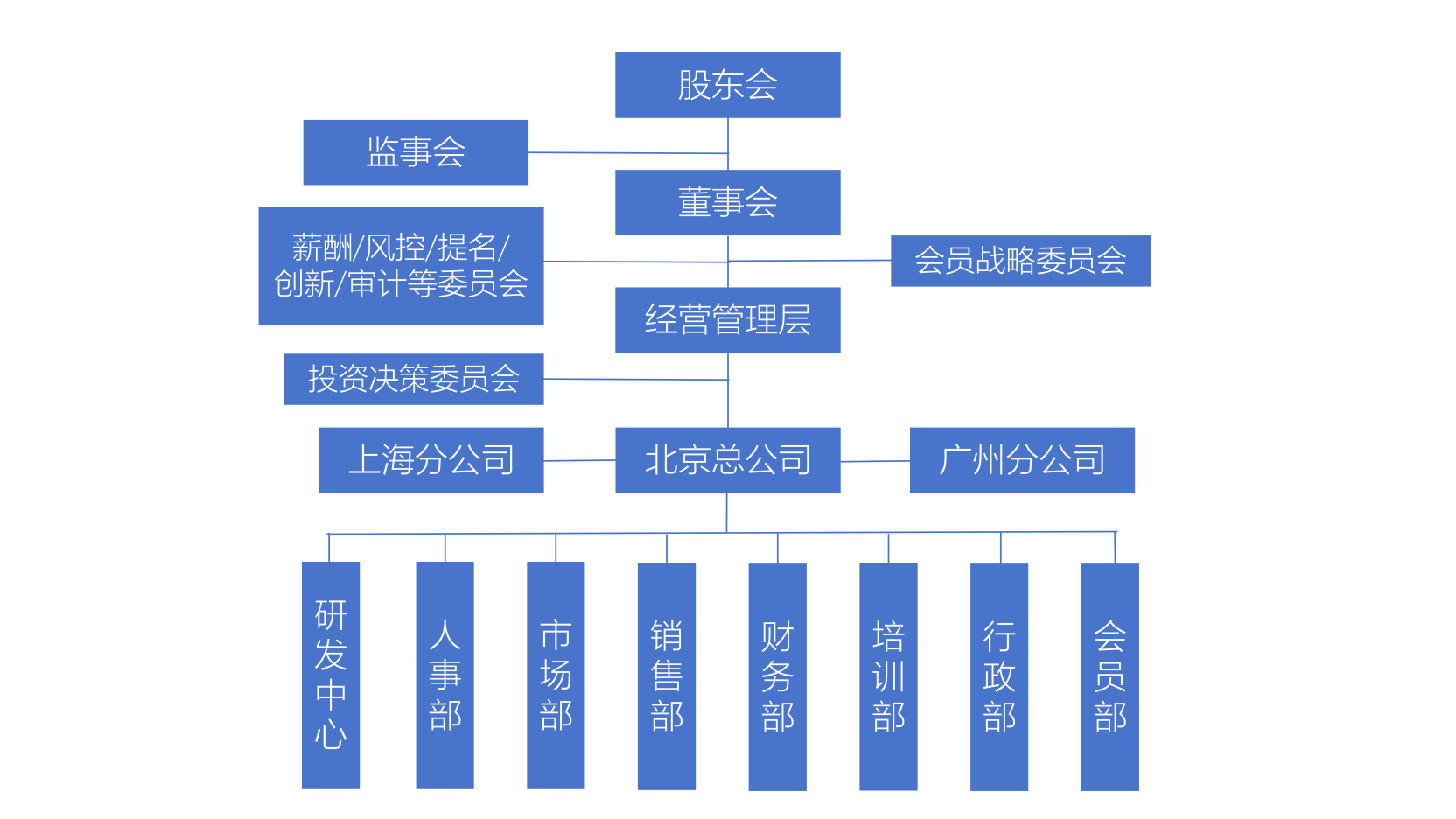 以会员制为经营方针的企业和非此类企业的组织架构没有本质上的不同,因为企业的所有权和资金来源没有本质的改变。但是既然对会员制经营有一定的重视,它也一定会在组织架构上有所体现。下面笔者画了一张企业组织常见的组织架构图。