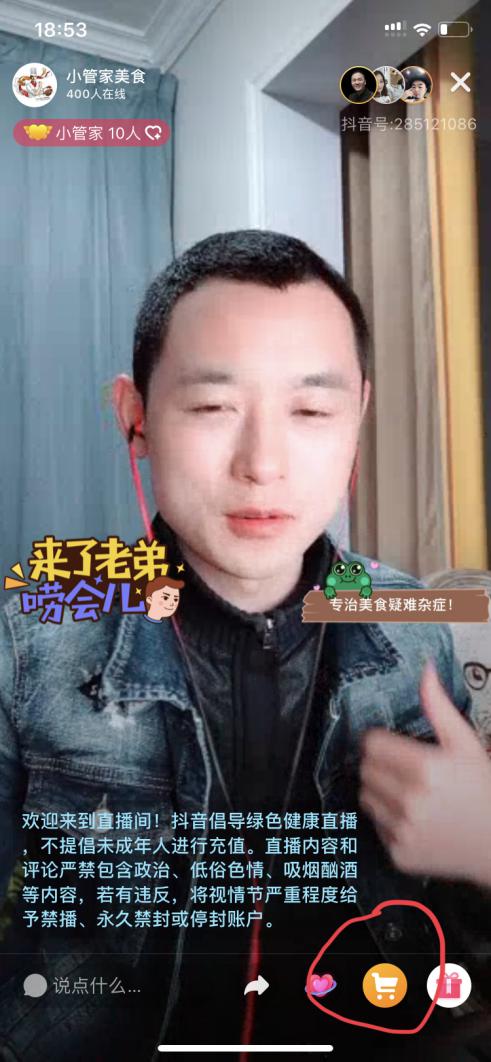 直播电商和视频电商的原理一样,在右下角有一个购物车按钮,点击就可以直接跳转到商品的购买链接,如图2-6所示。但是,开通直播电商,必须要有3000粉丝以上,才可以申请。直播电商也必须是电商橱窗和视频电商功能都开通之后,才会开通。