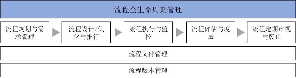 流程全生命周期管理与流程文件的全生命周期管理有相似之处,但不能简单地划等号。流程全生命周期管理包括几个阶段:流程规划与需求管理、流程设计/优化与推行、流程执行与监控、流程评估与度量和流程定期审视与废止,如下图所示,下文将按阶段展开说明。