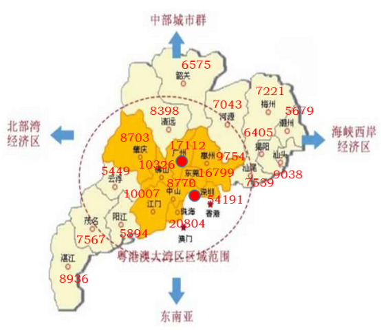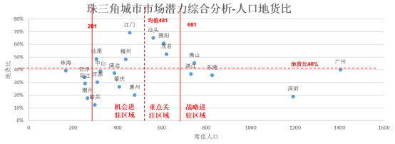 市场潜力从常住人口和地货比两个维度考虑,地货比较低且人口规模相对较大代表市场潜力较大。战略进驻区域城市共5个,分别为广州、深圳、东莞、佛山、湛江;重点关注区域城市共3个,分别为汕头、揭阳、茂名;机会进驻区域城市共9个,分别为韶关、河源、汕尾、中山、清远、肇庆、梅州、惠州、江门。