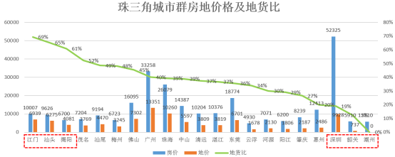 珠三角城市群整体房价中位值为9626元/㎡,地价中位值为3819元/㎡;珠三角城市群地货比中位值为37%。地货比较高的三个城市为江门、汕头、揭阳,应及时捕捉市场信息,防控拿地风险;地货比较低的三个城市为深圳、韶关、潮州,应作为重点关注城市,寻找机会适时进驻。