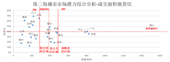 市场潜力从成交面积和地货比两个维度考虑,地货比较低且成交面积较大代表市场潜力较大。战略进驻区域城市共4个,分别为中山、广州、东莞、佛山;重点关注区域城市共5个,分别为惠州、深圳、珠海、清远、梅州;机会进驻区域城市共2个,分别为河源、湛江。