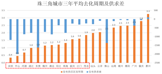 珠三角城市群住宅供应去化年限为1.59年,去化周期小于2年的有12个,分别为:深圳、中山、河源、湛江、东莞、梅州、清远、阳江、珠海、韶关、江门、茂名;整体来看,各城市市场均处于供不应求的状态。