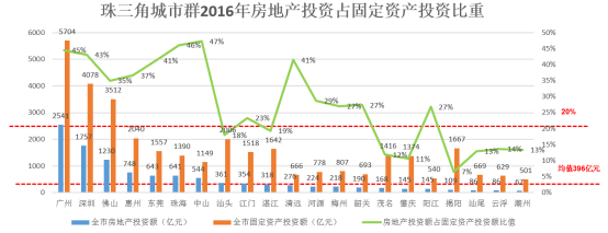 2016年珠三角城市群房地产投资额为10849亿元,占全国房地产投资额135284亿元的8.02%;房地产投资额在均值396亿元以上的城市有7个,分别是广州、深圳、佛山、惠州、东莞、珠海、中山。房地产投资占固定资产投资比重超过25%的有12个,分别为广州、深圳、佛山、惠州、东莞、珠海、中山、清远、河源、梅州、韶关、阳江,此区域房地产投资相对过热,建议谨慎拿地;介于15%至25%的3个,分别为汕头、江门、湛江,此区域为房地产合理投资区,建议重点关注;在15%以下的城市有6个,此区域房地产投资相对较少,存在潜在投资机会。