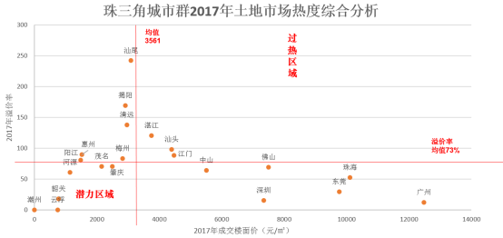 土地市场热度从成交楼面地价和溢价率两个维度考虑,成交楼面地价和溢价率均较低代表土地市场潜在热度较大。重点关注城市有潮州、云浮、韶关、河源、茂名、肇庆。(溢价率在5%以下市场公开程度较低,需谨慎关注。)