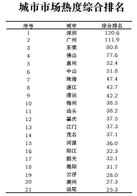珠三角城市群城市市场热度综合排名TOP3的城市为:深圳、广州、东莞。