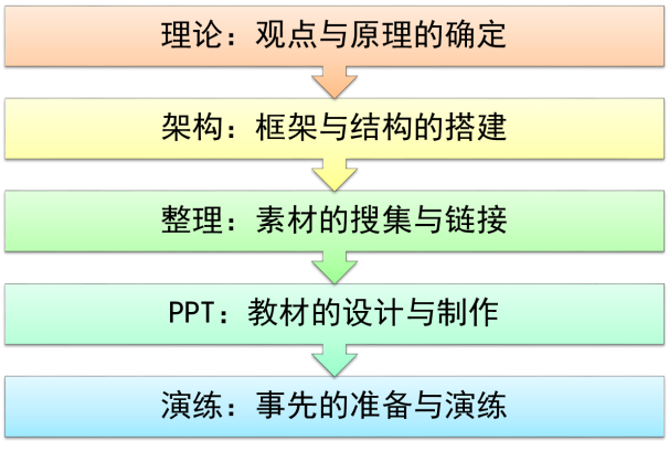 从观点与原理的确定到框架结构的搭建,然后整理素材进行连接,做成PPT,最后将PPT演练一遍。经过这样的过程,才能够设计和编纂出来好的课程。