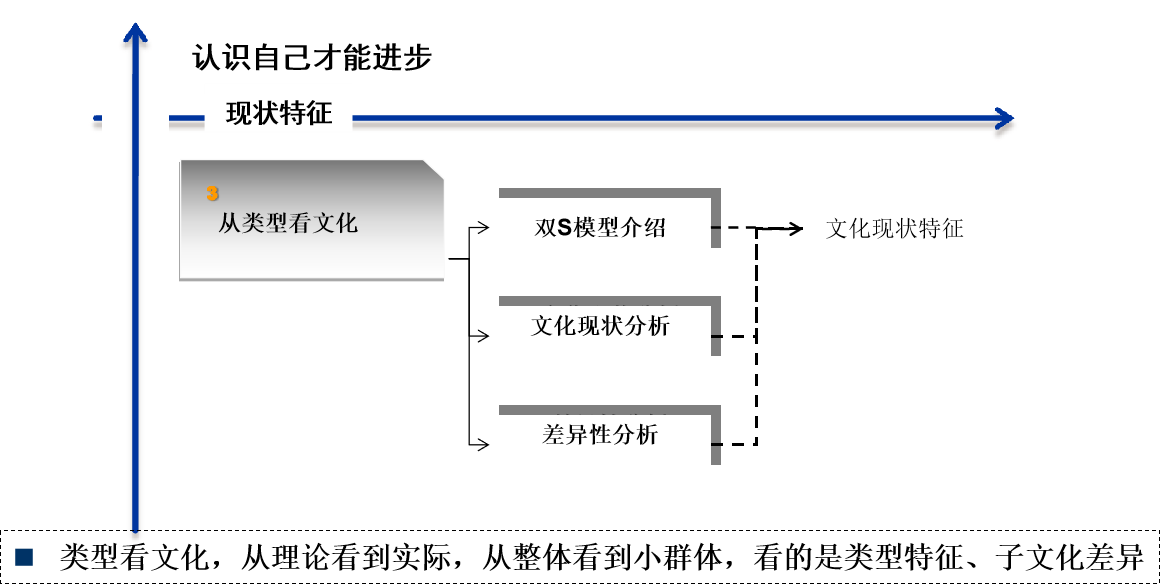 这种解构是在对企业宏观的历史、现状、未来的时间维度划分基础上,对每个阶段细化文化分析的切入视角,站在不同的位置对文化进行全息式分析。相应的操作:在企业的历史阶段,以“先外后内”的空间顺序设定分析视角,从外部“环境”到内部“实践”分析客户的文化传承;在现状阶段,以当前企业管理学界标准化的文化类型分析模型与工具,对客户的文化特征进行分析与归类;对于企业发展的未来阶段,仍应遵循“先外后内”的原则,对企业外部优秀的“同业”文化加以借鉴与分析,再对企业内部的“战略”文化的未来需求进行分析,进而明确企业文化变革的相关必要元素。