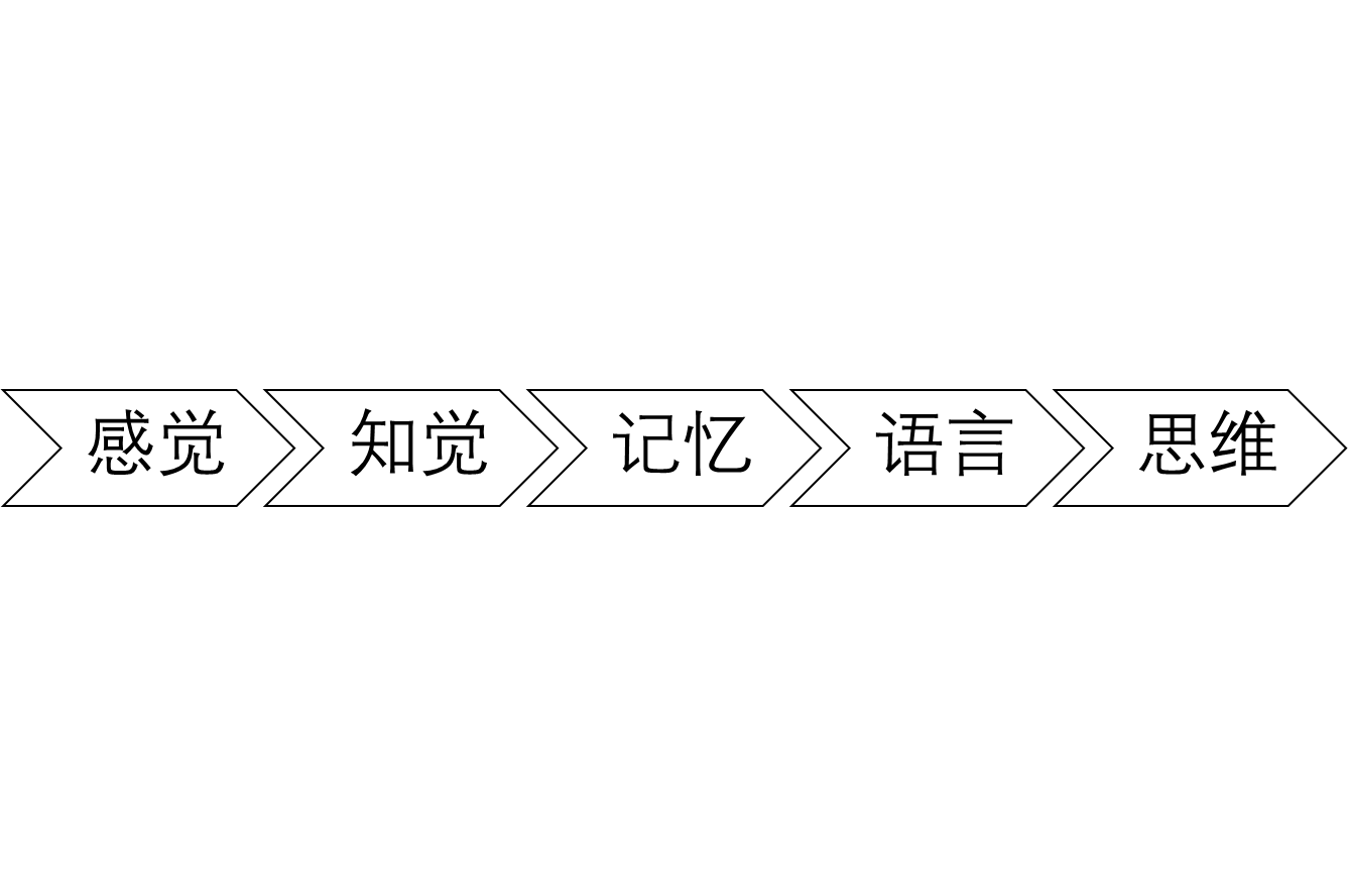 英国《柯林斯英汉大词典》对“思维thinking”的解释是“Thinking is the activity of using your brain by considering a problem or possibility or creating an idea”,这个解释沿袭了英国哲学家洛克(John Locke)的说法,即思维的目的在于获取认知。人对外部世界的认识有一个认知过程,从感受外部的信息到形成自身的记忆,从而组织语言表达(不见得是对他人说话,可以是文字,也可以在心中对自己说),最终用理性(逻辑思考和资源计算)对之进行处理——认知最后的理性处理过程我们称之为思维,思维是人类认知过程的高级形态(如下图)。