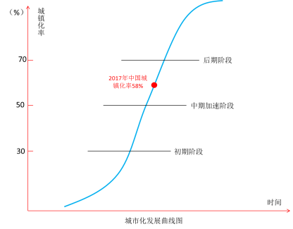 2017年,中国的城镇化率达到58.5%。世界城市化发展研究表明,当一个经济体的城镇化率达超50%后,将进入到城市化的中期加速阶段,城市化将告别以单个城市发展为主的时代,城市之间将出现严重分化,取而代之的则是以“城市群”模式组团发展,城市群将成为中国未来城镇化的主要形态。