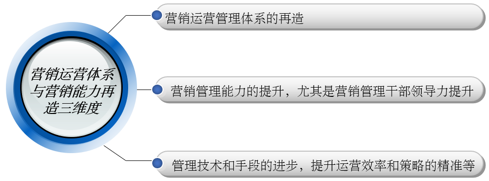 对于营销运营体系与管理能力再造,主要从三个角度来进行思考,同时也是企业进行营销组织能力再造的最佳管理实践的总结。首先,是营销运营管理体系的再造;其次,是营销组织管理能力的提升,这主要体现在营销干部领导力的提升;第三,随着互联网的发展,对于企业来说,利用互联网手段的管理技术和管理手段进步,内外部管理顺畅,提升运营效率和策略的精准度。