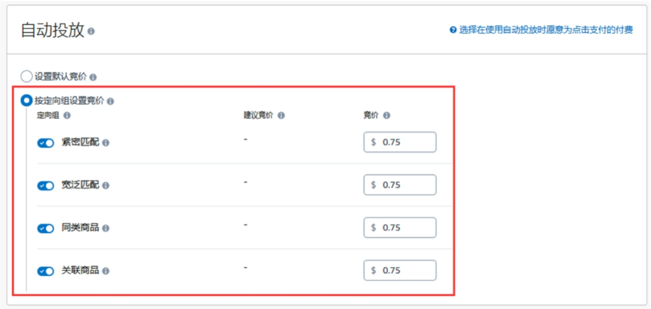 自动投放:自动投放广告(简称自动广告),卖家无需输入搜索关键词,亚马逊系统会依据卖家投放广告的 Listing 信息自动匹配相同或相似广告。自动投放的匹配类型有紧密匹配、宽泛匹配、同类商品和关联商品这 4 种,不同类型对应不同展示结果,卖家可对这 4 种匹配类型设置不同竞价(如下图)。