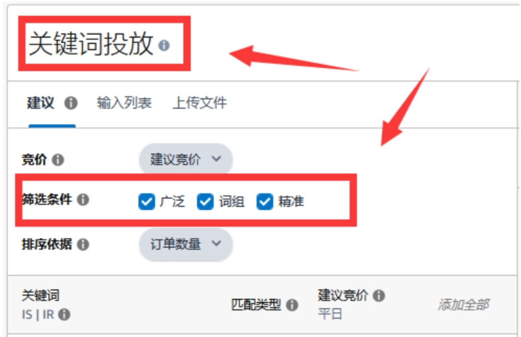 手动投放:手动投放广告(简称手动广告)与自动广告不同,卖家需自行输入投放的关键词或商品 ASIN。手动投放分为关键词投放和商品投放。按关键词手动投放时,卖家要搜集整理商品关键词并输入选定广告,当买家搜索关键词与卖家预设关键词相同或相似,商品就会出现在搜索结果中,关键词手动广告匹配类型有广泛、词组和精准三种(如下图)。