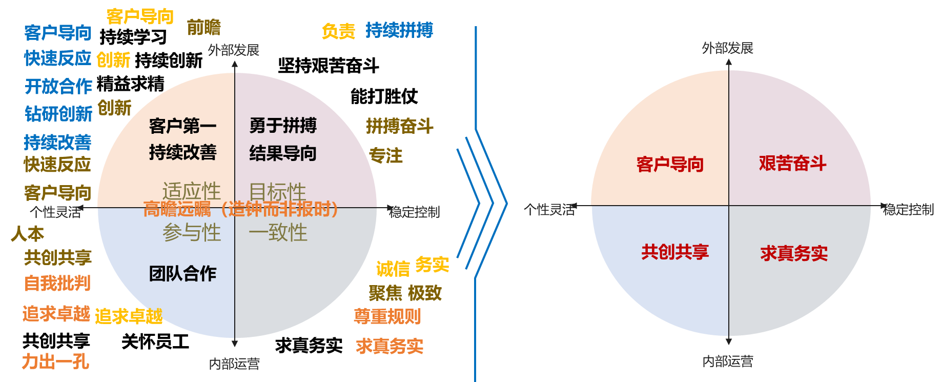 第三步,针对一个象限中有多个关键词的情况,把相近的关键词整合为一个,剩余的关键词按照“企业家期望-客户期望-员工期望”的顺位删减到只剩一个关键词,留下最底层、最核心的价值观,有些价值观确实必要但又不宜单列时可以融合到其中一条价值的内涵中。