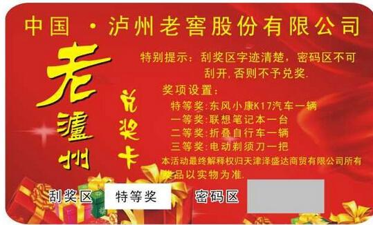 奖卡说明:印制刮奖卡张贴在产品酒盒上,刮奖区共分为两部分:刮奖区和密码区。刮奖区分为四小部分,千位刮奖区、百位刮奖区、十位刮奖区、个位刮奖区,每个刮奖区都有0~9的数字或者马的图案。其中,密码区不允许刮开,否则中奖无效。