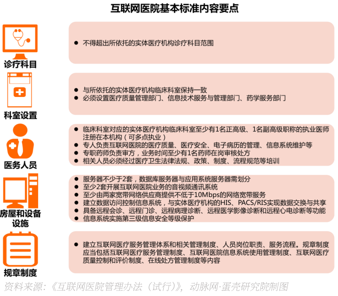 从文件具体要求可以看到,在诊疗科目和科室设置方面,互联网医院必须与线下依托的实体医疗机构一致,不得超出实体医疗机构的诊疗科目和临床科室范畴。这是出于医疗安全的考虑,互联网医院的医疗服务能力只有在实体医疗机构服务的能力范围内,才能确保线上诊疗的安全,有利于参照实体临床科室对相关医疗行为进行监管。