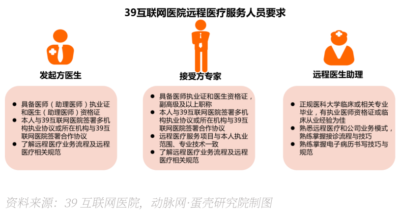 在医务人员方面,政策也提出了高标准配置要求,每个临床科室至少需要1名正高、1名副高职称的注册医师提供诊疗服务,专职药师提供在线审方服务,以及专职人员负责医疗质量安全和信息系统维护服务。可以看到,在医疗、药品、信息等方面对相应人员的资格都做出了规定,在确保医疗安全的前提下提高医疗质量。例如,39互联网医院在远程医疗服务方面,就对发起方医生、接收方专家和远程医生助理规定了从业资格和条件,如图2-4所示。