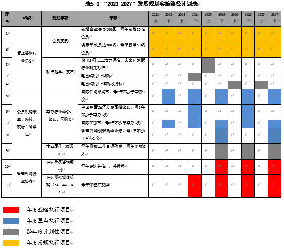 “2023-2027”发展规划实施路径计划图以“季度为节点,半年复盘一次,全年优化调整”的项目计划安排,具体实施根据实际情况进行完善调整。