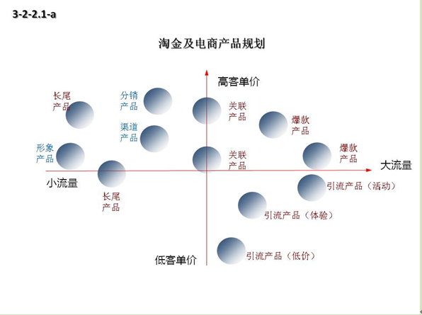 因此电商的产品营销组合由引流产品、关联产品、爆款产品、分销产品、长尾产品等组成,可以从人流量与销售量来构建出电商产品营销组合模型。如下图。