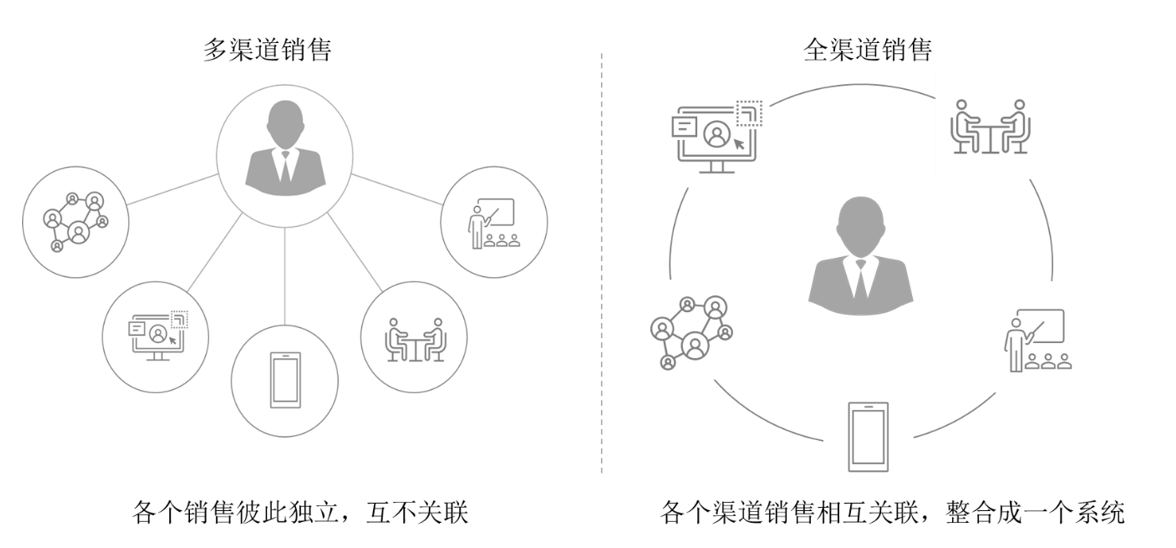 全渠道销售整合不同的销售渠道,创造无缝的一致的客户体验,让客户可以自由选择在哪里,以及如何获得产品和服务,同时确保每个产品和服务的质量相同。数字化趋势和新冠疫情加速了对全渠道互动的需求。为了向客户提供最佳体验,传统企业必须确定客户偏好的各种平台和渠道,采用新渠道和重塑传统渠道,建立跨渠道满足客户需求的能力,将不同平台和渠道整合成一致的体验。如图4所示。