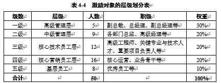 结合公司组织架构,根据岗位职级可以把激励对象划分为5个层级:高级管理层、中级管理层、核心技术员工层、核心营销员工层、基层员工。