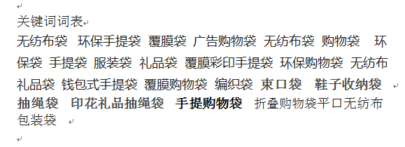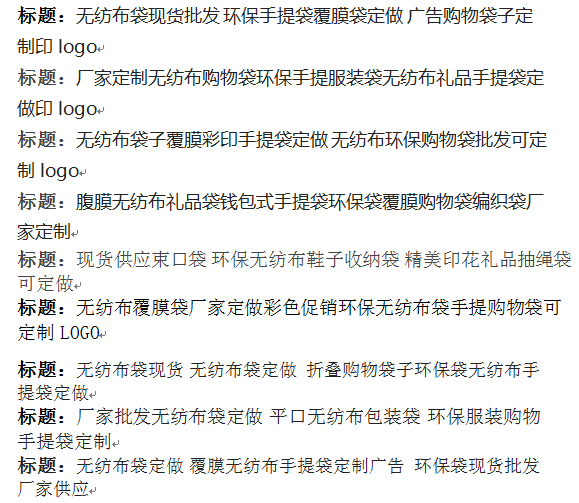 可能还有人不清晰,又是把标题抄下来,又是建关键词词库,又是建修饰词词库,这样做的目的是什么?学会拆解了别忘记回头再组合起来,也就是说我们把别人的东西拿给自己用。说白了就是:利用新建的关键词词库+新建的修饰词词库=新的标题!我们依据两个词库来现写一个标题:现货批发环保手提袋厂家批发印花礼品抽绳袋无纺布袋定制印LOGO。之前听到很多人这样说:我们的关键词就那些,写来写去写不出几个,但是我的产品有几十个,是不是要抄袭前面的或者别人的标题?其实不然,只要按照我们刚说的方法去操作,写标题是不是比以前轻松多了?是不是可以写无数个好标题?