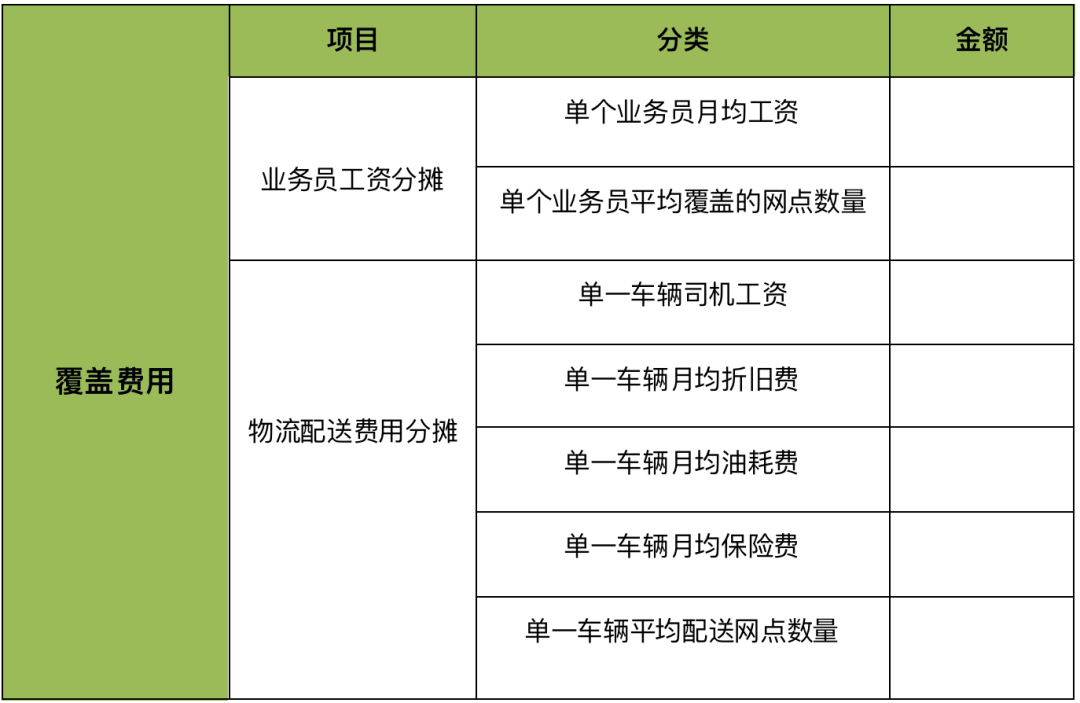 覆盖费用包括:业务员的工资分摊、物流配送费用分摊。