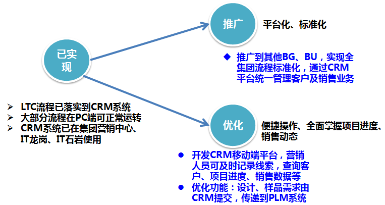 2)CRM系统复制推广,并将CRM打造成一个集中应用平台,不仅能传递流程信息,更能处理一些销售大数据,为销售运营提供合理决策。