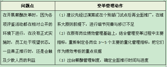 :薪酬改革对员工工资是一种大幅度的调整,说实话,进行这种大幅度的调整我们就一定要慎重,所以我们首先还是局部试行或者演算。在开展薪酬改革时,因为各项评鉴活动都在相对公开的环境下进行,在没有正式实施时,员工处于观望状态。一旦真正推行时,还是会触及少数人员的利益。所以,我们一定要试行,要谨慎地推进薪酬福利改革。