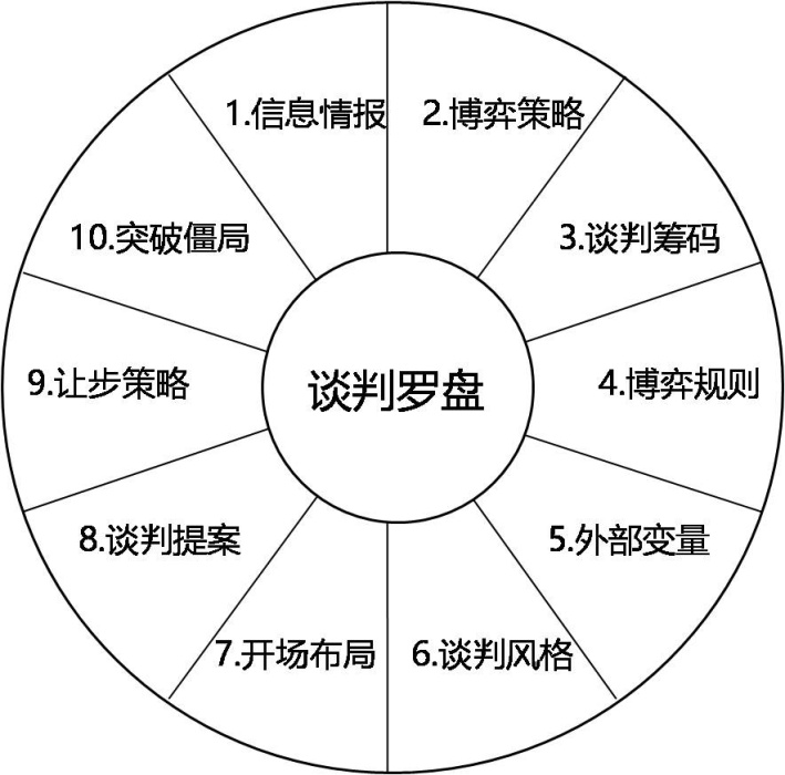 在大多数统筹型商业谈判的场景中,谈判者需要围绕以下十个关键成功要素来制定谈判策略,我们把这十个关键要素集成为谈判罗盘(见图1-1)。只要谈判者按照罗盘指引的方向来思考和行动,就能在谈判中“运筹帷幄,决胜千里”。