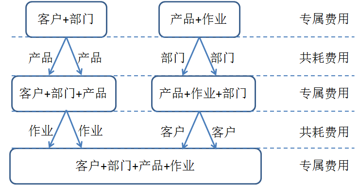 再如多口径归集,归集到某"客户+部门"的费用就是该"客户+部门"的专属费用,对于产品、作业维度来说,就是共耗费用,需要向不同产品和作业分摊。归集到某"产品+作业"的费用就是该"产品+作业"的专属费用,对于部门、客户维度来说,就是共耗费用,需要向不同部门和客户分摊。如图4-16所示。