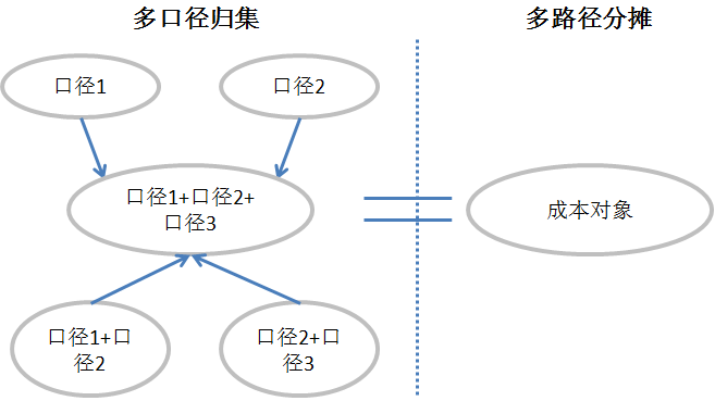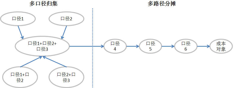 在大多数情况下,通过多口径归集仍到达不了最终目标,即多维组合的成本对象,因此需要进行多路径分摊。多口径归集与多路径分摊的关系如图4-18所示。