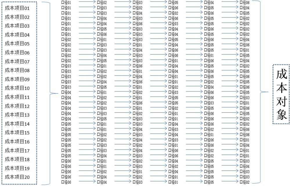 对于某个费用项目,传统成本计算往往采用一个分摊标准向产品进行分摊。多维组合成本计算,由于费用项目下的不同明细可能有不同的分摊标准,因此需要按每个明细项目进行分摊,工作量会比较大,当然也仅仅是工作量的问题。许多明细项目的归集和分摊方式是完全相同的,因此可在穷举式调研的基础上按归集和分摊方式对明细项目进行分类,同一分类的明细项目可统一进行归集和分摊。