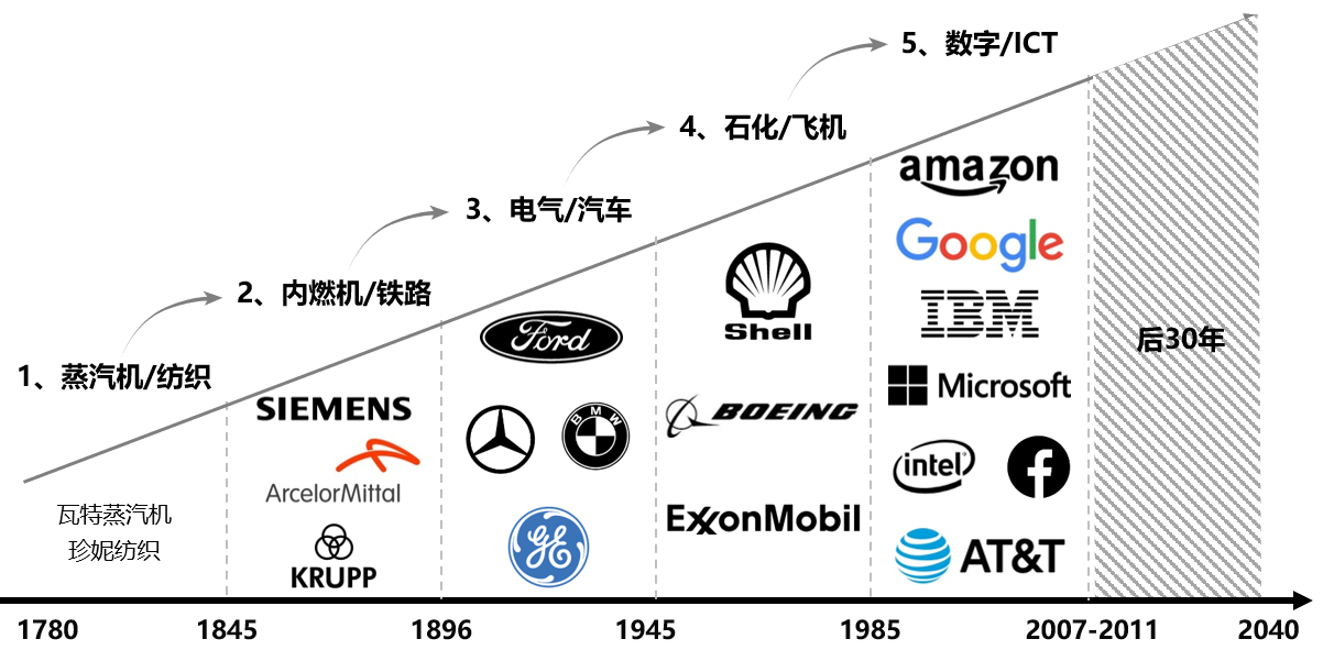 纵观工业革命以来,大产业周期如图2-15所示,基本可以划分为五个阶段。每个阶段都会产生几家改变世界的大企业,而伟大公司都曾跨越过不同的大产业周期。随着技术的加速发展,变化频率可能变得更快,周期变得更短。