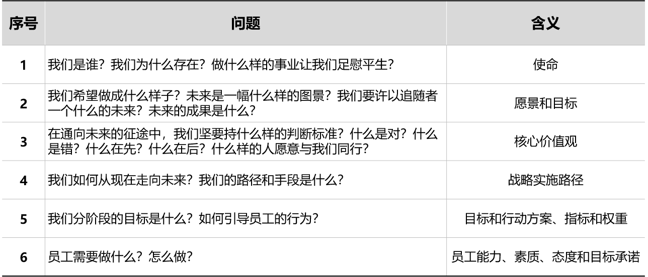 按照这些问题的逻辑思考,你会发现企业把美好的诺言和愿望转化为全体员工的行动是一个完整的体系,并把战略重点进行清晰地描述,通过可视化的方式,转化为全体成员可理解、可执行的行为过程。如表2-1所示。
