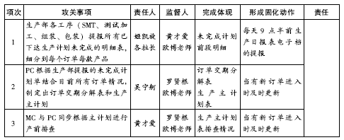 :以上就是订单准交率提升攻关方案,方案不仅列出了攻关目标,还有各部门的攻关动作。为了达到这个目标,我们把各部门要进行的改善动作都列出来了。