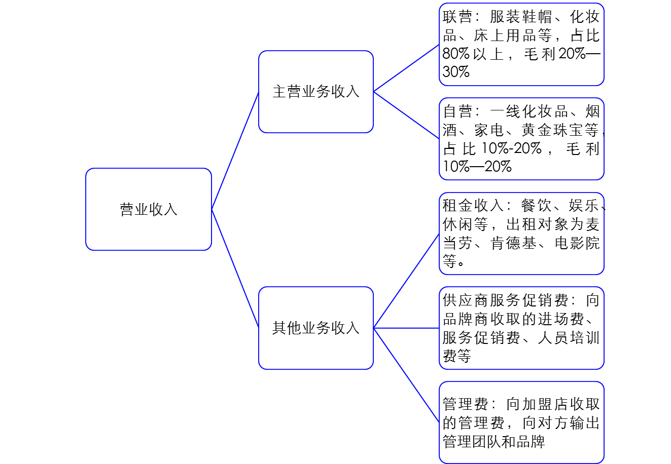 联营 | 明显商业地产属性 | 当期收入与品牌经营方销售收入密切相关,但与销售利润关联不大 | 不承担库存风险 | 基本不参与特定品牌运营,但需要选择品牌商 | 较低 | 风险较低,周期性较弱 |
