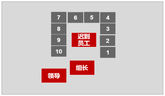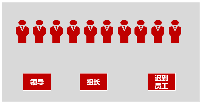 在召开早会的过程中,经常会有一些员工迟到,迟到后有的员工干脆就不参加早会了,有的员工悄悄的躲在了队伍的后面。可是,这个时候,组长并没有对迟到的员工进行批评或者点名,纵容了这样的行为发生。作为迟到的员工,组长一定要当面警示,单独给迟到的员工一个位置,将迟到的这种行为展示给所有人,作为提醒。