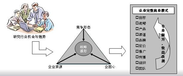 简单地说,就是以客观现实的产业结构为起点构建的新营销战略模式。包括三个步骤:产业结构及其驱动力、约束条件;竞争要素与策略(战略雏形);构建商业模式(以及优化及创新)。