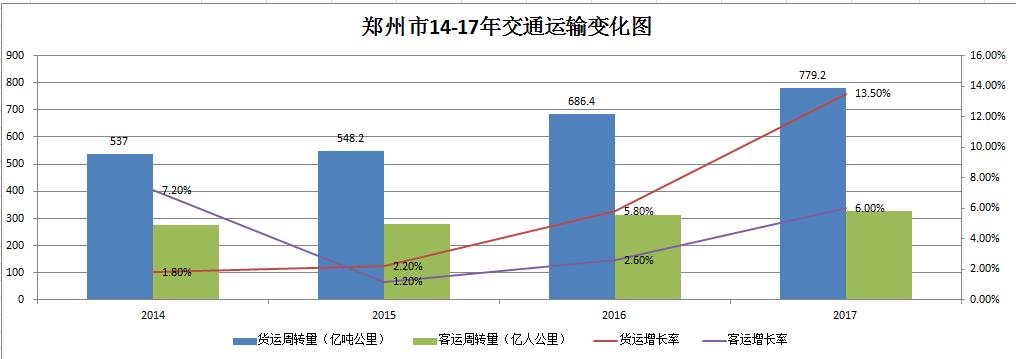 第一、高铁及其他大TOD模式增大了高铁枢纽及沿线城市对人流、物流的拉动作用。2014-2017年间,郑州客运周转量从2014年的274.9亿人公里上升到2017年的329.3亿人公里,总涨幅达19.79%,平均增长率为4.22%;货运周转量从2014年的537亿吨公里增长到2017年的779亿吨公里,总涨幅达45.10%,平均增长率为5.72%,四年间,郑州的人流、物流均保持较高速增长。