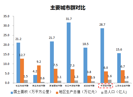 中原城市群是长三角、珠三角、京津冀之间,规模最大的城市群。是中部地区承接发达国家及我国东部地区产业转移、西部地区资源输出的枢纽和核心区域,是促进中部崛起、辐射带动中西部地区发展的核心增长极。截至2016年底,生产总值占全国9.48%,仅次于长三角、珠三角、京津冀,位居全国第四位,为中国经济第四增长极。