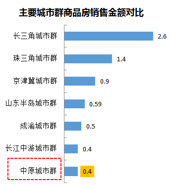 而从商品房销售金额对比来看,中原城市群与长三角、珠三角、京津冀三个城市群相比差距非常大,仅占长三角的1/6不到,与山东半岛、成渝城市群也有较大差距,房地产市场成熟度低。