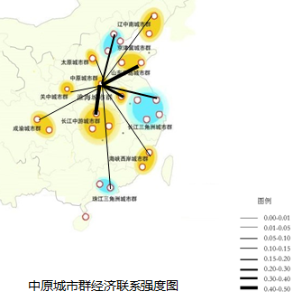 从城市群经济联系强度图可以看出,中原城市群和长江中游及山东半岛城市群联系最为密切,其次与淮海、京津冀、。长三角及关中城市群联系较为密切。