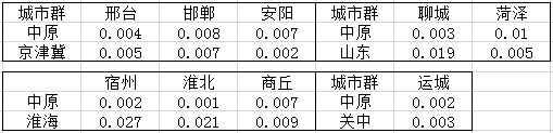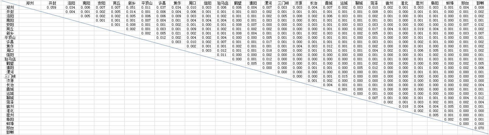 从中原内部城市经济联系强度表可以看出,郑州和开封(0.059)、郑州和新乡(0.051)、郑州和洛阳(0.034)联系相对密切。