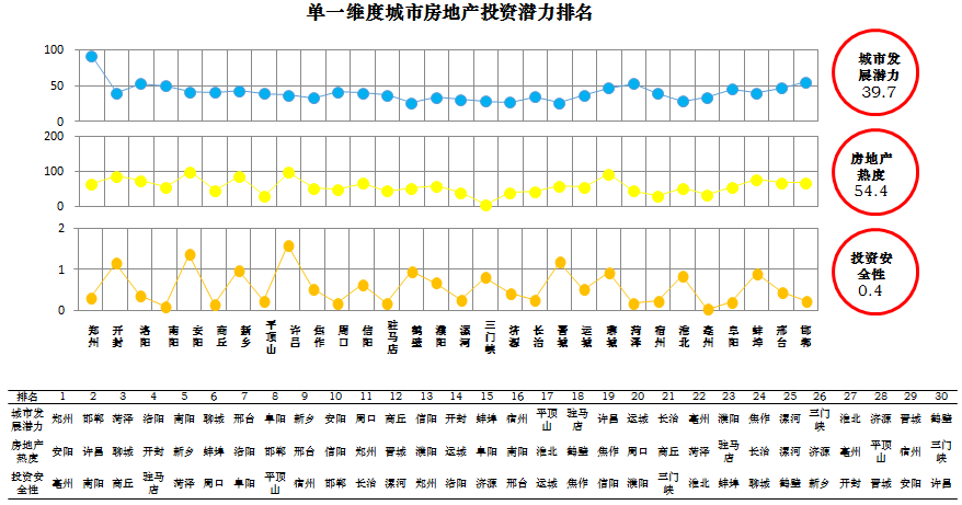 我们从城市发展潜力、房地产市场热度、投资安全性三个单一维度给出城市群各城市排名情况如下图: